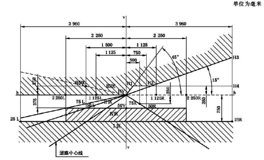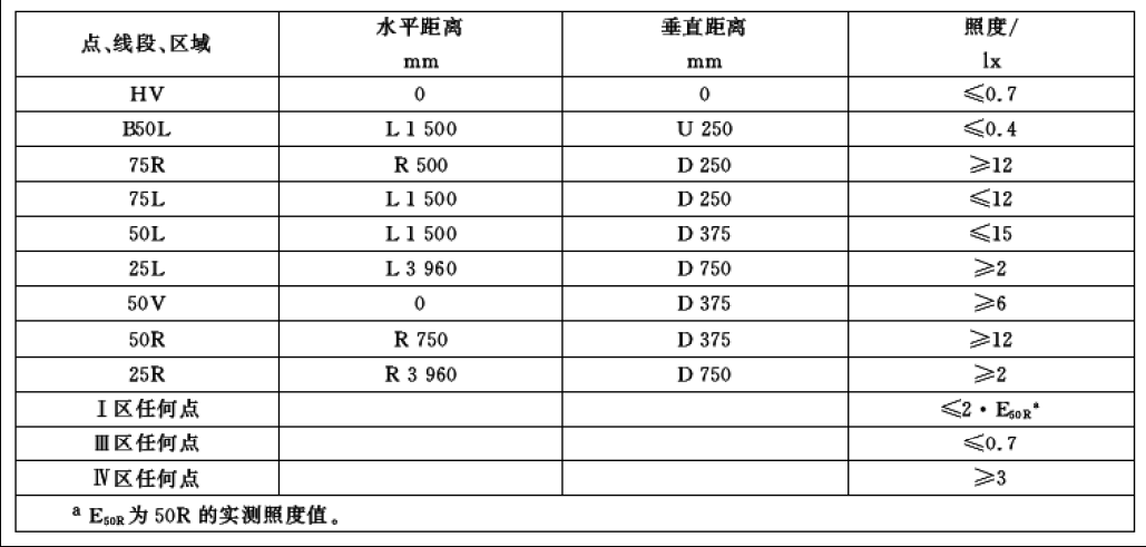 Ⅳ區代表車前方25~50 m處路面,是近光燈*主要的照明區域。要求該區任何點的照度不小于2lx,以保證有足夠的照明。