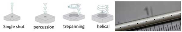 激光鉆孔利用聚焦的重復脈沖激光器汽化金屬,形成通孔。脈沖能量越大則汽化的金屬越多。作為激光加工領域主流應用之一,多年來發(fā)展了各種打孔技術:單脈沖,叩擊,旋轉打孔,螺旋打孔等。激光打孔在多種場景應用,包括橡膠、硅襯底等。