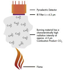基于紅外熱釋電原理的火焰探測技術,利用紅外熱釋電傳感器作為敏感元,接受火焰燃燒輻射的紅外線熱信號,并轉換為電壓/電流信號。目前國內外通用的方式是選擇多通道探測器,不同通道安置不同波長的濾光片,在測試火焰的同時,也實時監測背景環境存在的干擾輻射,極大地減少誤報事件的發生。