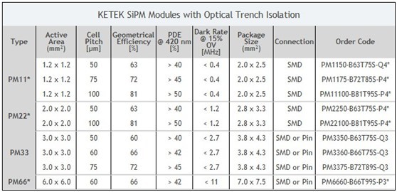 1、德國Ketek公司是低噪聲SiPM的供應商,其產品相比其他同類產品具有極低的暗噪聲和工作電壓以及較高的光子探測效率。