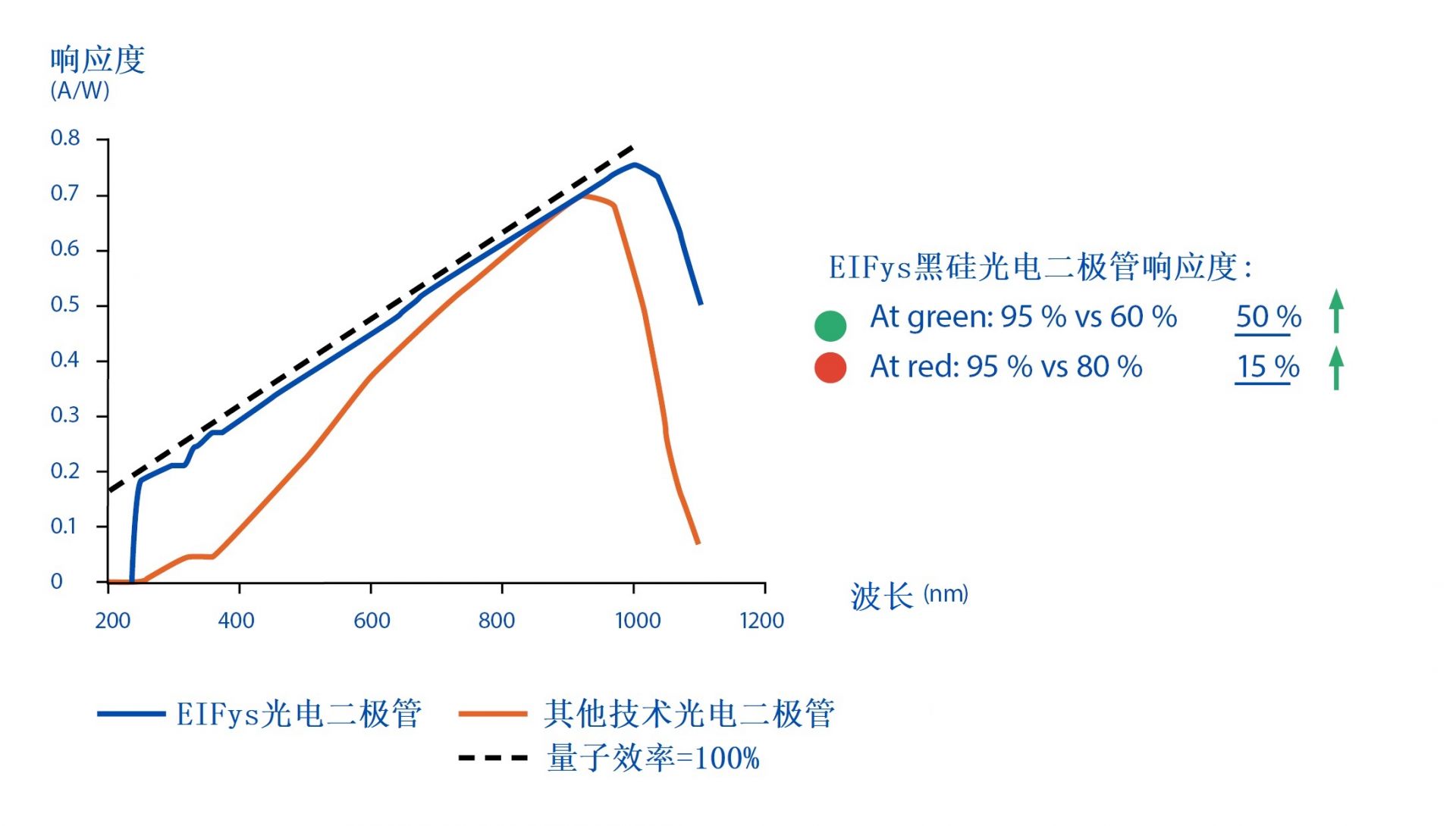 在智能手表等可穿戴設備中,需要高精度測量和滿足長續(xù)航時間才能滿足用戶的需求,在所有其他組件中,光電二極管是捕捉從皮膚反射的光信號的關(guān)鍵傳感器,因此,無論之后使用何種軟件AI算法,光電二極管的性能決定了原始數(shù)據(jù)的質(zhì)量,光電二極管重要的參數(shù)之一是靈敏度,給定噪聲的條件下,更高的靈敏度意味著更高的SNR(信噪比),從而可以得到更準確的測量能力,可以檢測以前不可見的更小信號,與其他光電二極管技術(shù)相比,EIFys提供的高靈敏度光電二極管,采用黑硅技術(shù),如下圖所示,綠光的響應度提高了50%左右,紅光的響應度提高了15%左右,光電二極管高靈敏度的另外一個好處是它可以用更少的光來達到同等的精度,這意味著更少的功耗,可提高穿戴設備的續(xù)航時間。
