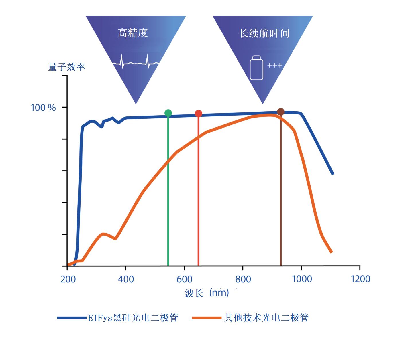 光電二極管是系統(tǒng)中原始信號的來源,EIFys能提供市面上靈敏度很高黑硅光電二極管,它在200-1100nm響應范圍內(nèi)實現(xiàn)了近100%的量子效率,更靈敏的光電二極管,可以在給定的LED驅(qū)動電流下提供更好的測量數(shù)據(jù)精度,另一方面,光電二極管越靈敏,驅(qū)動LED所需的電流就越小,可降低系統(tǒng)的功率,提高續(xù)航時間。