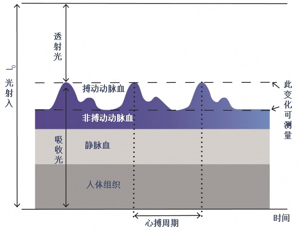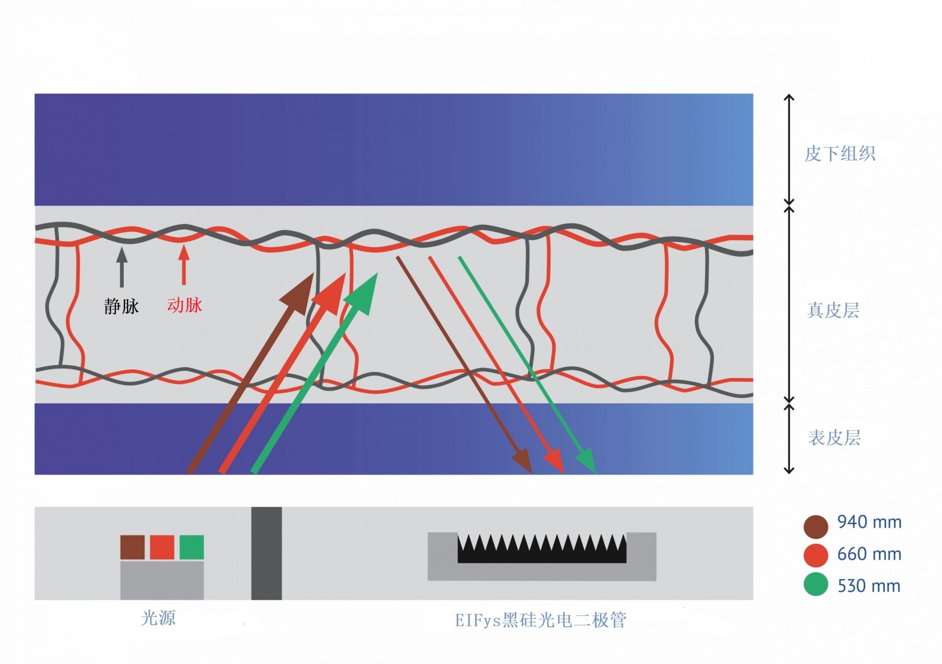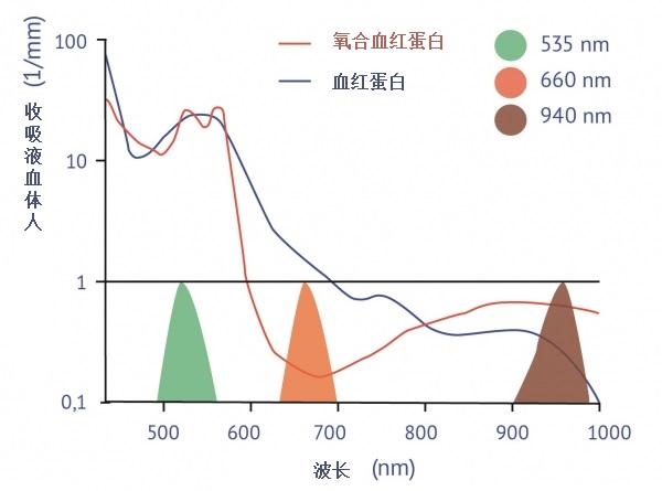 利用光電容積描記(PPG)是使用光電傳感器測量心率和血氧含量水平的基本方法,535nm綠光用于測量心率,皮膚中的血液量隨著心臟跳動周期而變化,因此綠光的吸收和皮膚對綠光的反射也會隨著周期變化,綠光的光信號變化頻率就是心率。同樣的,光的吸收也會根據(jù)血液中與血紅蛋白結(jié)合的氧氣水平而變化,由于660nm紅光和940nm紅外光對氧含量更敏感,因此660nm紅光和940nm紅外光的反射信號主要用來計算氧含量。