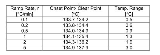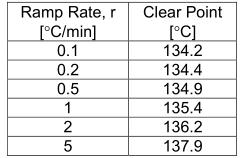 澄清點比起始點更被加熱斜坡速率嚴重影響。一般來說,澄清點隨著斜坡率的增加而增加(見表1)。