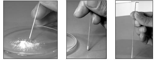 要將粉末樣品裝入毛細管,只需從毛細管開口的一端輕輕壓入樣品幾次。然后翻轉毛細管在堅硬表面上輕敲幾次(首選方法),使得樣品自動落在毛細管底部。或者,可使用設備自帶的細鐵絲(通條)插入毛細管進一步壓實樣品,提高測量的重復性。