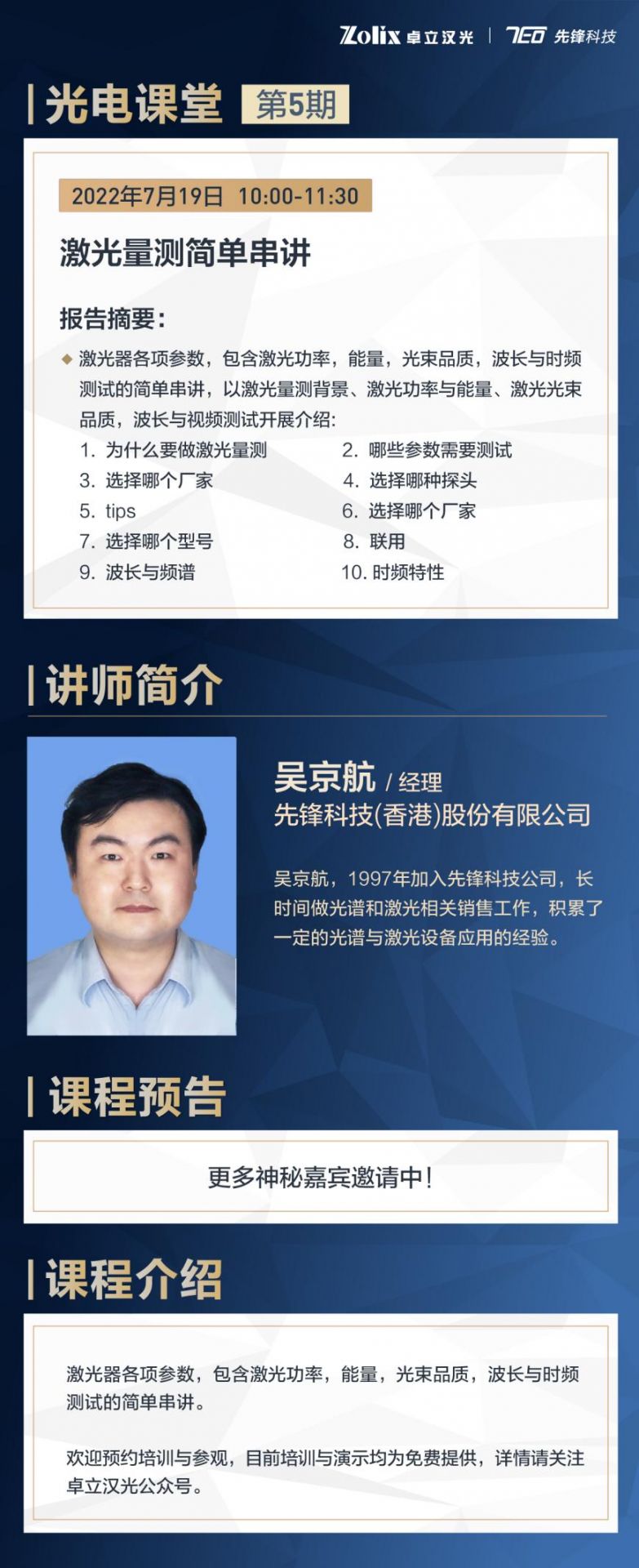 為多方位展現光電儀器研制領域的最新成果,使客戶進一步了解和熟悉光電產品及應用,卓立漢光&先鋒科技秉持“優質服務”的理念,特別策劃制作《光電課堂》網絡專題直播課。歡迎預約培訓與參觀,目前培訓與演示均為免費提供,詳情請關注先鋒公眾號。
