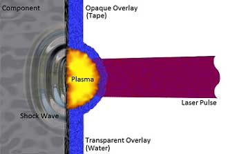 激光沖擊強化通常采用納秒尺度的大能量激光。待處理工件表面覆以不透明吸收層以及約束層,激光被吸收層吸收之后產生等離子體;在約束層的限制下,等離子體的爆炸在材料表面產生強烈的沖擊波并向材料內部內傳播。經過處理的材料產生相變和應力,可以非常顯著的提升材料的強度、耐磨性、抗疲勞特性;沖擊強化還可用于金屬疲勞恢復。