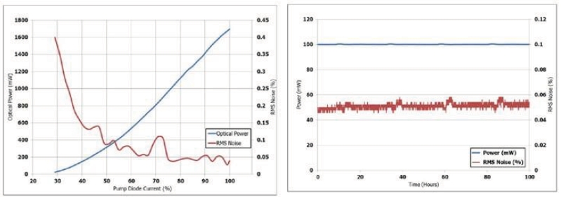 左圖, Ventus 532 藍線為輸出功率, 紅線為RMS 噪聲隨二極體泵浦源驅(qū)動電流的變化圖右圖, Ventus 532 出光100 個小時后的輸出功率( 藍線) 及噪聲