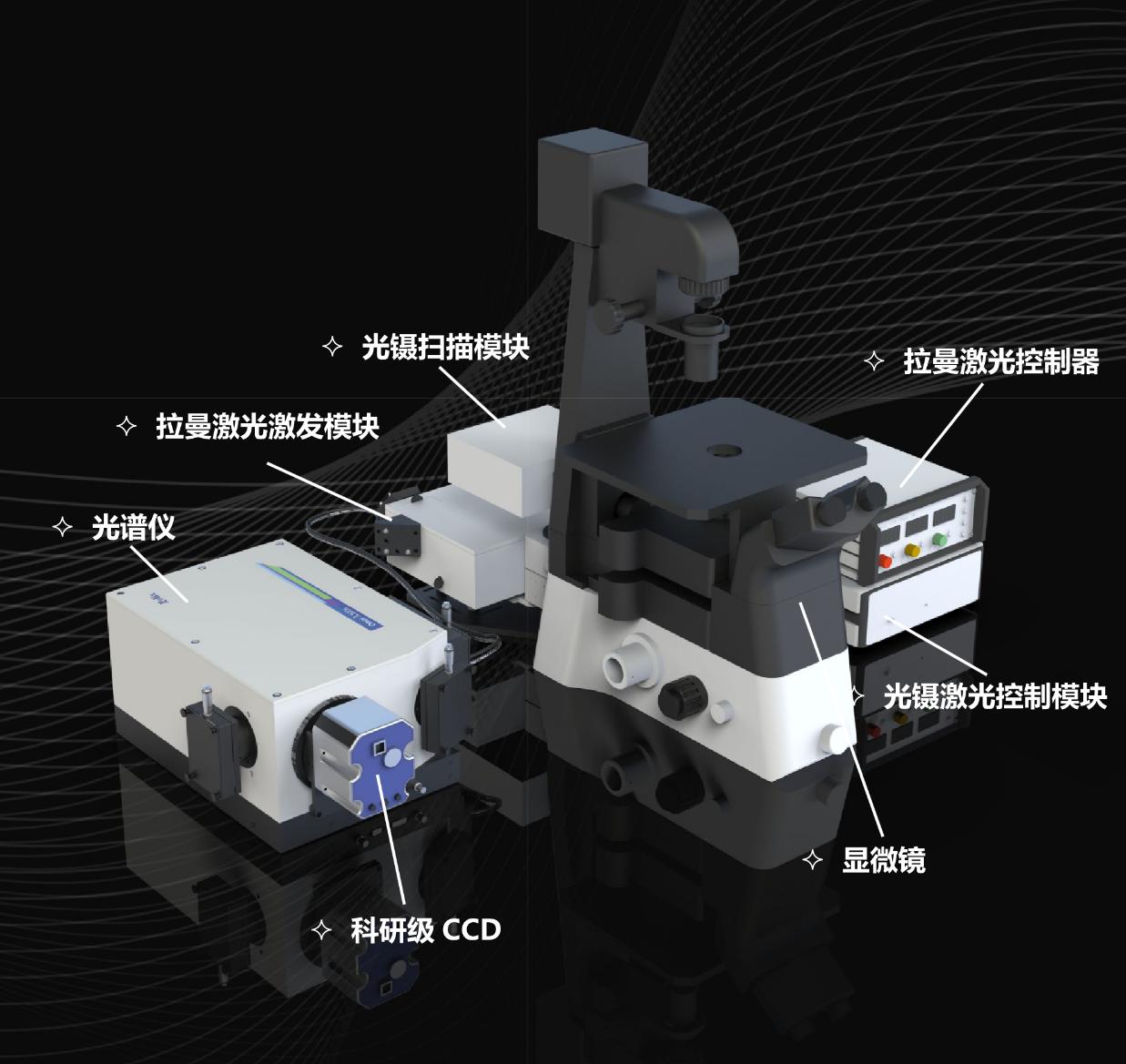 結(jié)構(gòu)二:在卓立漢光自主研制的標準RTS 顯微共聚焦拉曼光譜儀的基礎(chǔ)上配置具有雙層無限遠光路的倒置顯微鏡,上層光路多光阱光鑷系統(tǒng),拉曼激光從顯微鏡的側(cè)口進入,拉曼信號原路返回接光譜儀,可內(nèi)置不同波長激光器,也可外部耦合激光器,拉曼信號通過光纖或者空間光路耦合到光譜儀,光路如下: