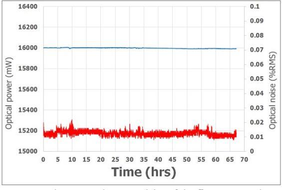 Finesse pure 超過70 小時的出光測試,噪聲( 紅線)~0.01%, 功率穩(wěn)定度( 藍線)<0.05%;