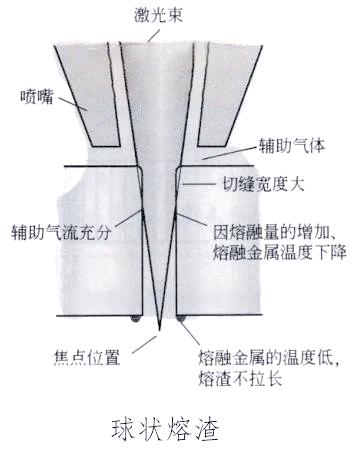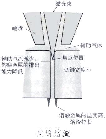 當(dāng)焦點位置調(diào)整不當(dāng),導(dǎo)致切縫過窄時,會出現(xiàn)掛渣呈尖狀,難以清除,同時切割面錐度較小,使得工件難以取出。 |