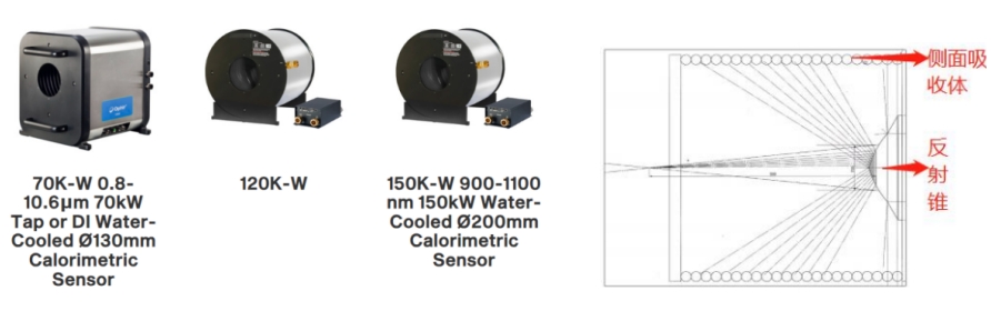 超高功率測試功率計:采用熱電堆吸收,通過測試水溫變化從而做到高達(dá)150kW激光功率的測試。超大口徑,安全無背向散射,可多向操作等特性,是超高激光器功率的測試最優(yōu)選擇;