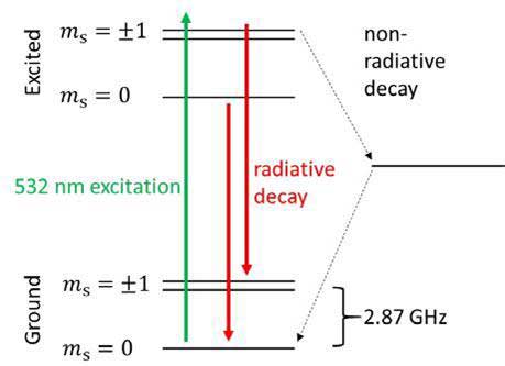 顧名思義,氮空位色心 (NV-Nitrogen-Vacancy center)(圖2)是由一個氮原子取代金剛石中的一個碳原子,然后捕獲周圍的一個空穴形成的。在NV位上懸浮鍵的電子通過雜化產生自旋-1系統,具有明確的能量狀態和較長的自旋壽命,即使在室溫下也是如此。這樣就可以通過磁共振的自旋操控技術在精確定時的微波磁場下來控制NV點的自旋狀態。由于它的能級對外部磁場和電場都很敏感,使得這種自旋狀態可以作為外部環境的傳感器。