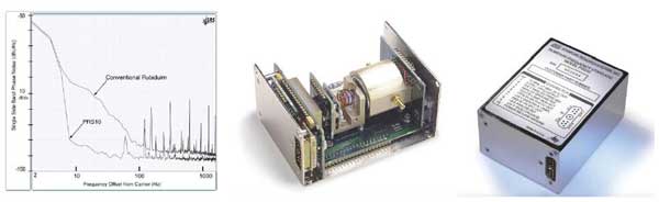 美國(guó)SRS公司銣鐘PRS10的10MHz輸出來自第三倍頻,應(yīng)力補(bǔ)償(SC-cut)晶體振蕩器工作在一個(gè)恒溫室中,雙回路RF合成器(晶體頻率22.482MHz)產(chǎn)生359.72MHz,并讓6.834 GHz頻率通過階躍恢復(fù)二極管。這樣的設(shè)計(jì)可以使相位噪聲非常低(< −130 dBc/Hz at 10 Hz),即便在沒有鎖定銣原子的情況下,其輸出表現(xiàn)也很良好(老化率:<5 × 1E−10 /day),與傳統(tǒng)銣鐘相比相位噪聲降低42dB(如下圖),并使用側(cè)臂裝有1毫克銣的燈。消除了銣耗盡作為一種失效機(jī)制,并提供了更好的溫度控制,而沒有多余的閃爍噪聲。