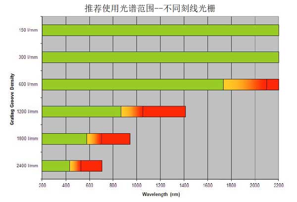 在相同測試條件下(狹縫不變),提升光譜分辨率的方法通常有兩個:一是延長光譜儀的焦距,同等情況下,光譜儀的焦距越長,分辨率越高! 但這樣就意味著光譜儀的尺寸變得越來越大,光路調(diào)校變得越來越困難! 另一個有效途徑是利用高刻畫線的衍射光柵,,比如同等情況下,2400g/mm 的光柵分辨率相比1200g/mm 的光柵可以提升大約1倍; 但同樣由于刻畫光柵衍射角度的關(guān)系,高刻線光柵的波長使用范圍也同樣會急劇縮小,比如,1200g/mm 的光柵最大波長使用范圍到1200nm, 而2400g/mm 的光柵最大波長使用范圍則只能到600nm, 也就是說通常高刻線光柵都只適用于紫外波長范圍的高分辨率光譜測試, 對于可見光(VIS)以及延伸的紅外 NIR 波段,要想獲得高分辨率的光譜,提高光譜儀的焦距幾乎變成了可行的一種方案!