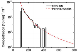 我們改進了TRPS系統上層液體,(Izon Science Ltd, Christchurch, New Zealand) 使膜孔有了光學延展性。改進之后,我們評估了TRPS檢測人體尿液囊泡的尺寸和濃度。之所以選擇尿液囊泡,是因為尿液里含有較高濃度的尿液囊泡,同時脂蛋白和蛋白質集結的污染程度較小。圖3顯示了用TRPS測量的尿液囊泡的尺寸分布以及濃度,尿液囊泡的濃度隨著尺寸的增加而降低,我們能檢測到的*小尺度的尿囊為100nm直徑