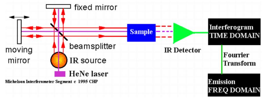 如上圖,紅外復(fù)合光源通過半透半反鏡后,分別經(jīng)過動鏡(Moving Mirror)和固定反射鏡(Fixed Mirror)后,兩路反射回的光發(fā)生干涉。干涉光通過樣品后,通過紅外探測器后被記錄下來。在動鏡以恒定速度移動時,探測器就會記錄下光強隨時間的變化關(guān)系。通過一系列的傅里葉變換和計算,就可以得到光強隨頻率的變化,從而得到光強隨波長變化的關(guān)系。
