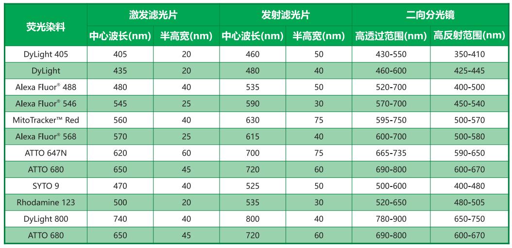 常用熒光濾光片組合