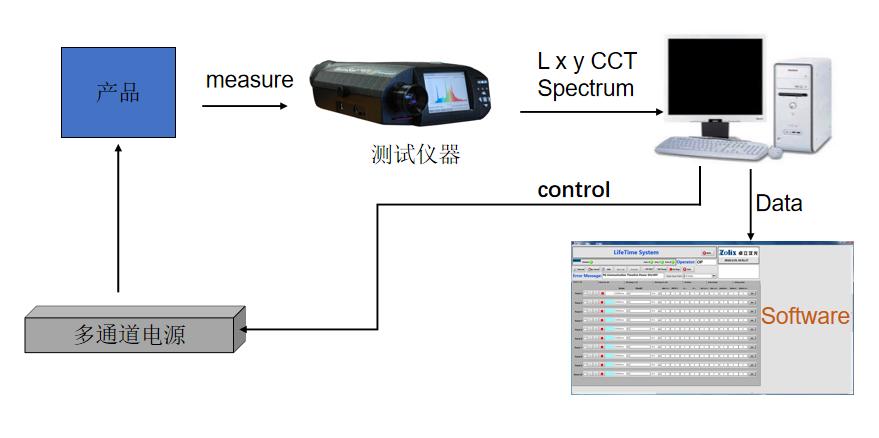 - 采用平鋪式布局,搭載亮度計在X\Y\Z三個方向運動,產(chǎn)品點亮后,亮度計依次采集亮度變化,獲取lifetime數(shù)據(jù)。
