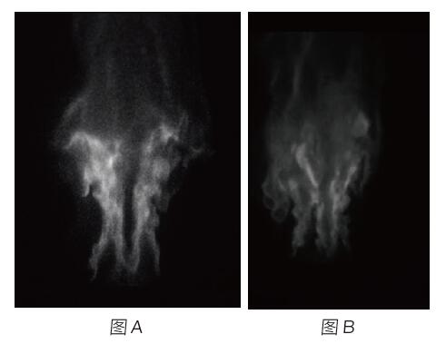 IIM-C225+ 高速相機,~5000X 增益,常開模式,310nm 帶通濾光片(紫外鏡頭)。圖A: 2000fps 幀頻,圖B: 5000fps 幀頻。