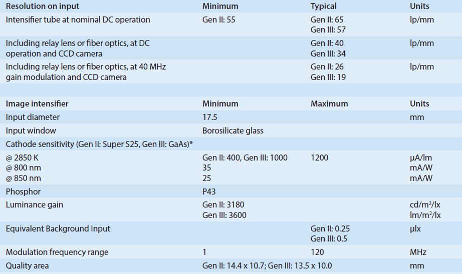 | Spatial resolution | 26 lp/mm (Gen II); 19 lp/mm (Gen III) |