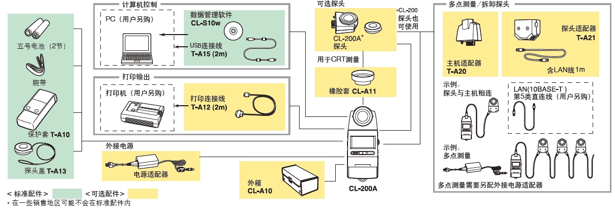 測量探頭,主機適配器T-A20,探頭適配器T-A21, 外接電源適配器AC-A308(1-10個探頭) 外接電源適配器AC-A311(1-30個探頭) 打印連接線T-A12,橡膠套CL-A11,外箱CL-A10 |
