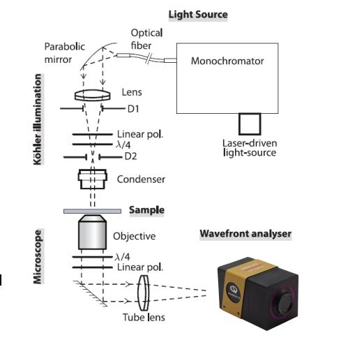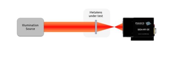 通常,在檢測超表面或者超透鏡時,我們會使用上圖的架構,構成顯微成像方案。該方案里,光源照明部分由激光驅動白光光源(通常建議選用由我司代理的Energetiq Technologies公司的EQ-99X系列產品加單色儀),當然也可以選用非相干光源。顯微物鏡的倍數和焦距可根據待測樣品靈活選定,波前的表征由法國Phasics公司的波前傳感器SID4系列產品完成。該產品可以覆蓋從紫外到中遠紅外波段的測試要求。SID4系列波前傳感器可以直接和業內標準顯微鏡對接,無需中轉器件。測量時,通過樣品的光在SID4系列波前傳感器上被顯微鏡成像,再通過軟件分析干涉圖像,即可得出波前相位畸變。每次測量時都需要在拍攝待測物體的圖像之前,獲取參考圖像,然后從目標圖像中減去參考圖像以補償入射光束的本身缺陷引入的誤差。