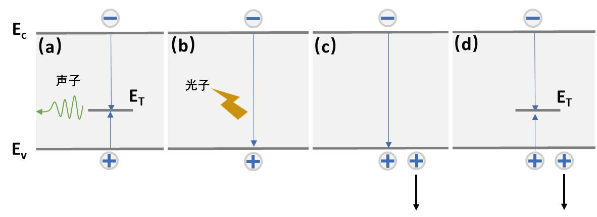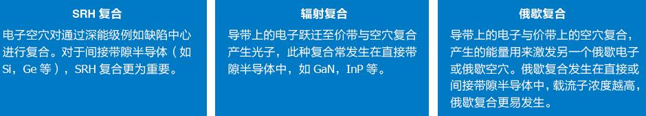 當(dāng)外界作用撤掉后,處于非平衡態(tài)的載流子會(huì)通過(guò)復(fù)合而產(chǎn)生衰減,直到載流子濃度恢復(fù)到之前的熱平衡狀態(tài)。載流子的復(fù)合方式可以分為三類(lèi):SRH 復(fù)合、輻射復(fù)合及俄歇復(fù)合(直接和間接)。