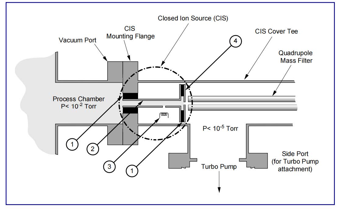 CIS陽極可以看作是一個直接連接到工藝室的高電導管。電離區中的壓力與工藝室中的壓力基本相同。CIS電離器在過程壓力下直接通過電子沖擊產生離子,而質譜分析儀的其余部分和燈絲保持在高真空條件下。直接采樣提供了良好的靈敏度(由于可用的大離子密度)和快速的響應時間。“記憶效應”,通常與壓力降低和電導孔有關,是顯著減少的。此外,由于不同氣體分子通過PPR孔徑的分子量依賴性擴散系數而引起的分餾效應也不存在。