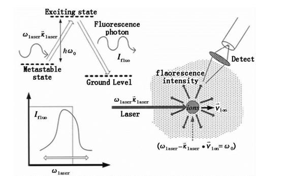 圖1[1]為LIF的基本原理圖,在一個三能級系統中:離子處于亞穩態時,當照射激光能量等于躍遷激發的能量,離子被泵浦到激發態。由于激發態不穩定,離子又會迅速退激到基態并輻射出熒光。在激發態上停留時間很短暫(一般只有幾納秒寬度)。由于離子不是靜止的,根據多普勒效應可知,在激光傳輸方向上存在一個速度選擇,只有在激光傳輸方向上滿足一定速度的離子才能被特定頻率的激光誘導激發:窄帶激光束(ωlaser,κlaser)入射,在入射方向上,只有離子速度 和激光頻率滿足關系式 時,才能通過相應的激光激發被泵浦到激發態。對入射激光頻率進行掃描變換,測量相應的熒光光強變化,就能得到亞穩態離子速度分布函數在入射激光方向上的投影。如果假定亞穩態離子溫度和主體基態離子溫度一致,離子速度分布函數等動力學參數即可獲得。