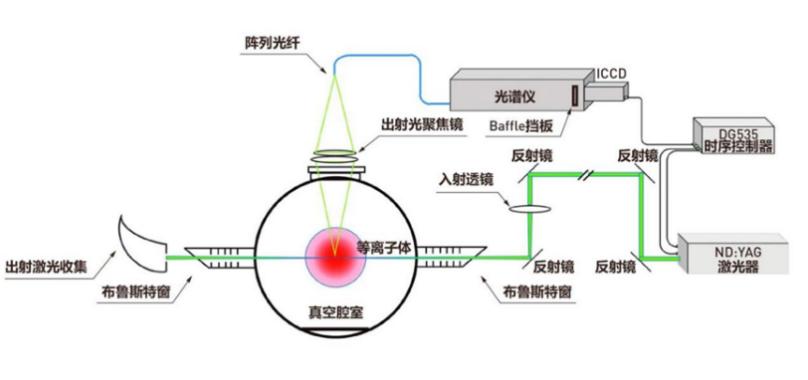 等離子體中心到透鏡的距離L和光纖的芯徑,及像斑決定了收集透鏡的焦距。舉例如下:如果像斑要求是fP =2mm,光纖芯徑400mm, 則物像比是4,如果L=320mm, 則透鏡的焦距就是320/4=80mm。同時如果觀測的等離子體范圍是50mm,那光纖一字排開的范圍就是50mm/4=12.5mm。這個寬度和連接譜儀一側的光纖束的尺寸很接近了,連接收集透鏡一側光纖也應該是密集排布,這樣兩端容納的光纖數量就是匹配的。