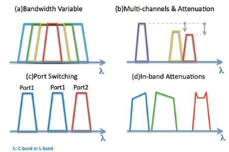 WSS-1000 可實現濾波曲線的多方面編程,包括濾波線形、衰減、多通道濾波、端口(1×1,1×2,1×4,1×9)選擇等。