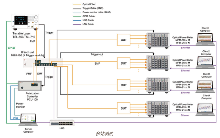多站測(cè)試中,TSL、PCU與MCU 構(gòu)成一個(gè)服務(wù)中心,分發(fā)觸發(fā)信號(hào)及光束到不同的測(cè)試站。每個(gè)測(cè)試站包括功率計(jì)和客戶端PC。在運(yùn)行過(guò)程中,TS持續(xù)的掃頻,使得每個(gè)測(cè)試站可以獨(dú)立而并行地工作。多站測(cè)試架構(gòu)極大提升了高精度測(cè)量與分析的效率。