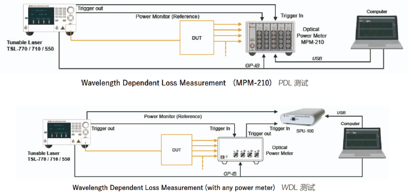 快速掃描測(cè)量系統(tǒng)整合了TSL 可調(diào)諧激光器、MPM 光功率計(jì)、PCU 偏振控制器及根據(jù)用戶需求自定義的軟件,為R&D 及生產(chǎn)環(huán)境的IL、WDL、PDL 測(cè)試提供快速、多功能、全自動(dòng)的平臺(tái)。系統(tǒng)同時(shí)采集可調(diào)諧光源的輸出功率及DUT 透過(guò)的光功率作實(shí)時(shí)參比,獲取高精度的IL、WDL 以及PDL(采用Muller 矩陣方法)。