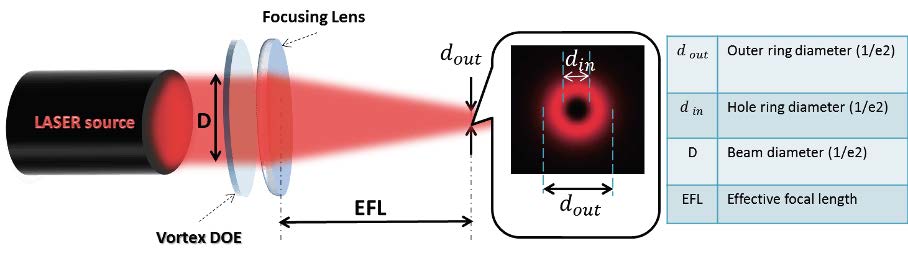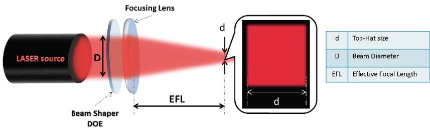 衍射光學元件(Diffractive Optical Elements,DOE)是新型的微納光學器件,通常是在光學基底的表面通過光刻工藝制造的二維陣列排列或訂制規律排列的、微米尺度的衍射單元。激光經過衍射光學元件后其波前位相被精密調控,從而實現在一定位置(通常是焦點)的特定強度分布、位相分布,并可實現縱向傳播特性調控。