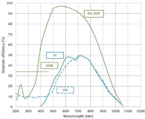 • Dual AR 雙鍍膜選項,同時提升紫外及近紅外波段量子效率