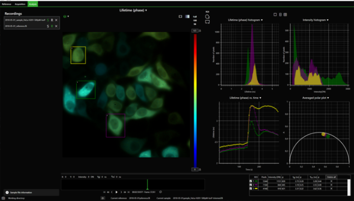 易用:強大的軟件即時分析您的數據,并可視化計算熒光壽命,記錄圖像兼容ImageJ,FIJI,Matlab和MetaMorph,詳細的統計數據可以導出到Excel工作表;