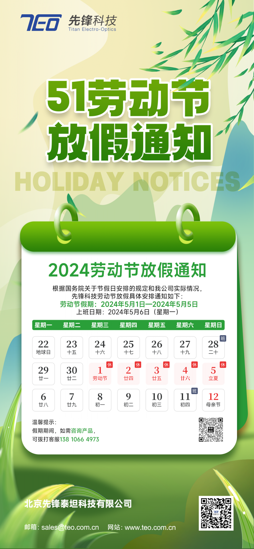 先鋒科技勞動節放假具體安排通知如下:勞動節假期:2024年5月1日-2024年5月5日 上班日期:2024年5月6日(星期一)