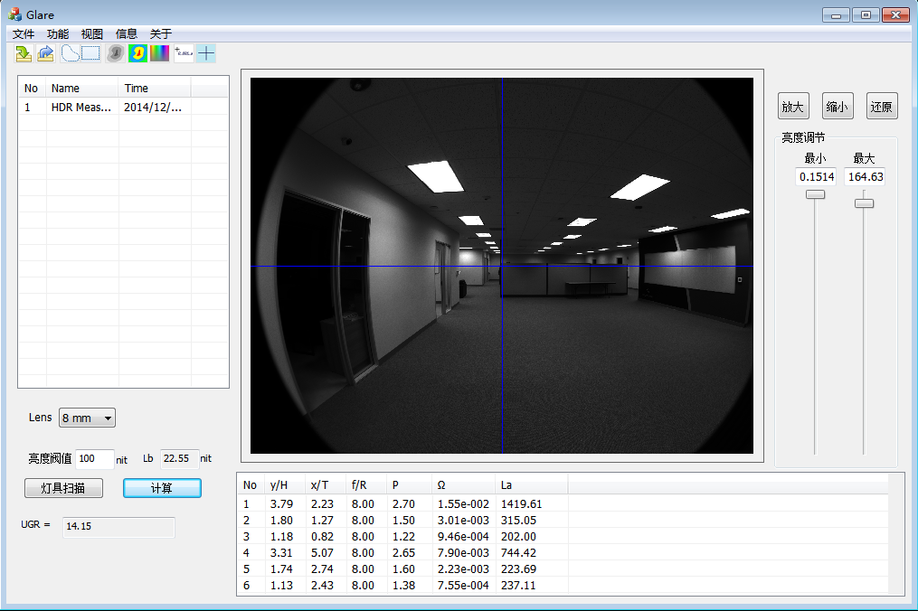 Glare眩光測量軟件解決了不同的環境光源和觀察者視角的空間位置對應關系,合理準確地描述了光在人眼的散射效應。對不同的照明條件和環境,做了相應的測試方案,解決了室內、室外等不同場景的眩光測試。